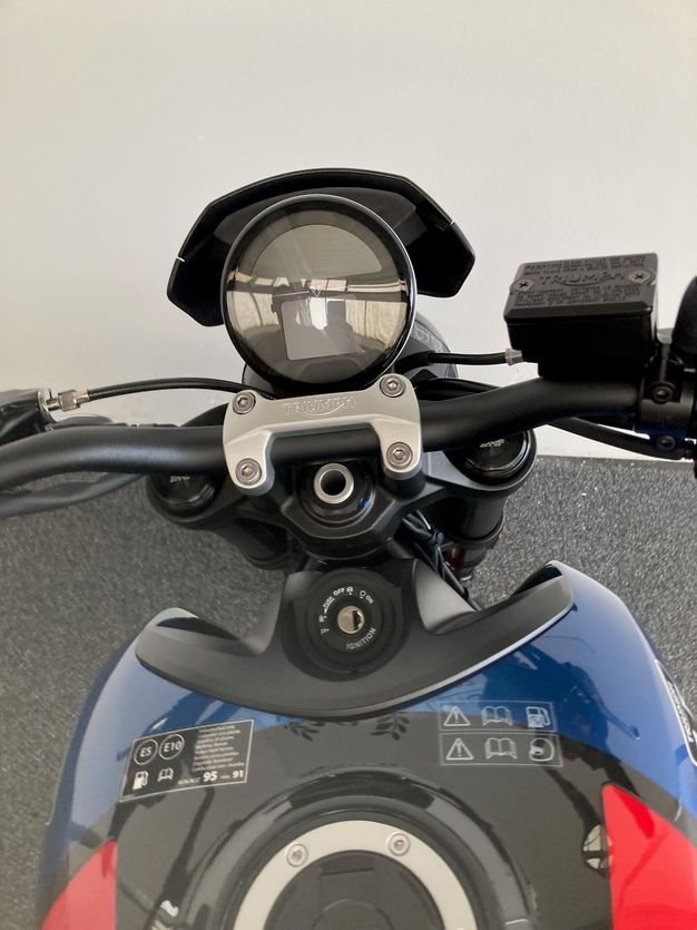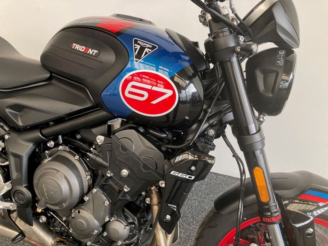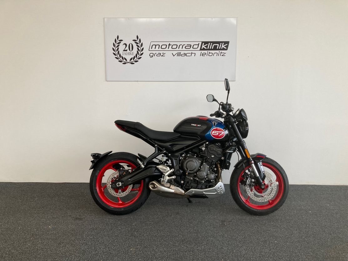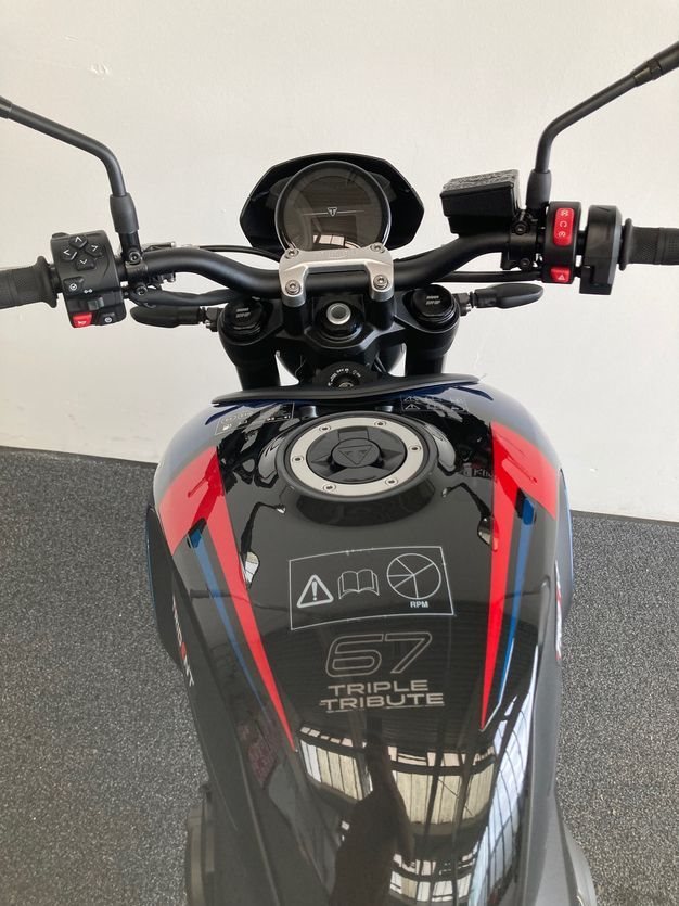 Trident 660 Triple Tribute mit ABS, Quickshifter, Tempomat, Markante neue Optik und Räder in Diablo Red, Sport-Fahrmodus, Optimiertes Kurven ABS und Traktionskontrolle, My Triumph Konnektivitätssystem, 805mm Sitzhöhe, 14 L Tankvolumen,190 kg fahrfertig, 16.000km Serviceintervall.